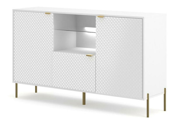 Ste milovníkom klasického nábytku s nádychom moderny? Ak je odpoveď áno, odporúčame vám trojdverovú komodu z kolekcie , ktorá dodá nevšednú eleganciu každej miestnosti Predstavujeme trojdverovú komodu v elegantnom štýle! Rafinovaný a jednoduchý tvar vyzerá perfektne! Má sklenenú policu, ktorá vám umožní vystaviť suveníry a dekorácie, a tri uzamykateľné skrinky uľahčia prístup ku všetkému, čo chcete mať po ruke, ale nie nevyhnutne na očiach. Čelá komody sú vyrobené z MDF dosky, korpus je vyrobený z drevotriesky potiahnutej melamínom. Drážkovaná predná časť a kvé nožičky a rúčky zlatej farby mu dodávajú jedinečný charakter. Nábytok je navyše vybavený LED osvetlením a systémom tichého zatvárania Detaily produktu: korpus vyrobený z melamínovej drevotriesky hrúbky 16 mm, ktorá zaručuje odolnosť proti vlhkosti a poškodeniu, drážkované čelá z MDF dosky hrúbky 18 mm, farba: biela, povrchová úprava. : matný (korpus) a lesklý (čelá), kvé nožičky a úchytky zlatej farby, hrany vystužené ABS hranami, systém tichého zatvárania, LED osvetlenie ako štandard Dodajte svojej obývačke šik ešte dnes!