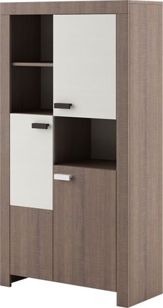 Skrinka, ktorá obsahuje tri dvierka a tri otvorené poličky.
