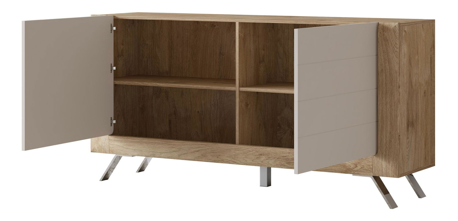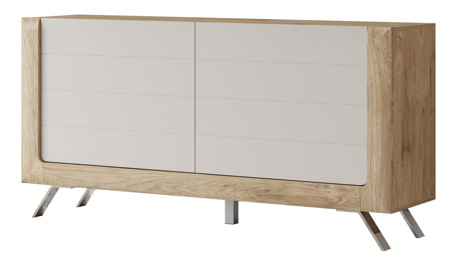 Táto moderná skrinka je navrhnutá s dôrazom na štýl a praktickosť, vhodná pre každý súčasný interiér. Vyrobená z odolnej laminovanej drevotriesky s hrúbkou 15 mm a chránená ABS hranami, ponúka spoľahlivú trvácnosť a odolnosť proti opotrebovaniu. Stabilitu a poskytujúci vzhľad zabezpečujú masívne pochrómované kovové nožičky. Skrinka je vybavená bezúchytným systémom Push to Open s tichým zatváraním, čo zaručuje pohodlné a bezhlučné používanie.