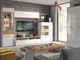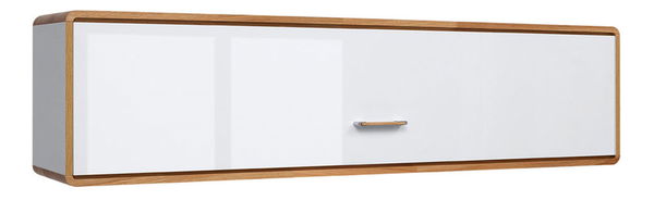 Závesná praktická skrinka rozdelená 2 deliacími stenami na 3 časti. Dostupná vo farebnom prevedení: biela + dub prírodný/biely vysoký lesk.