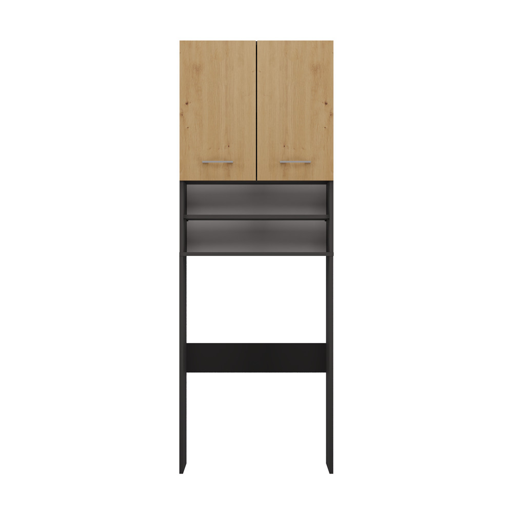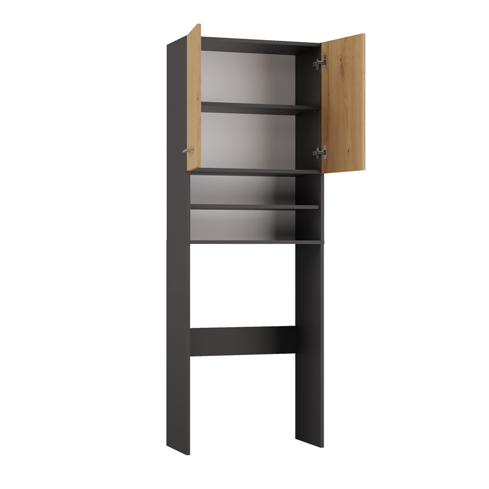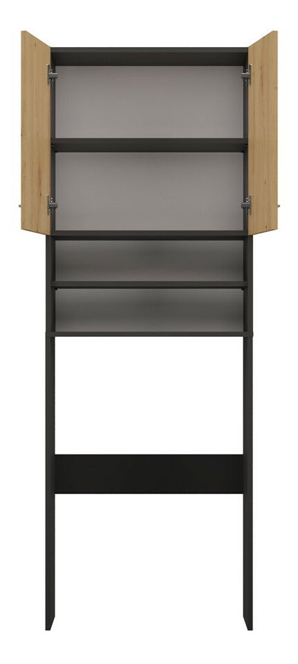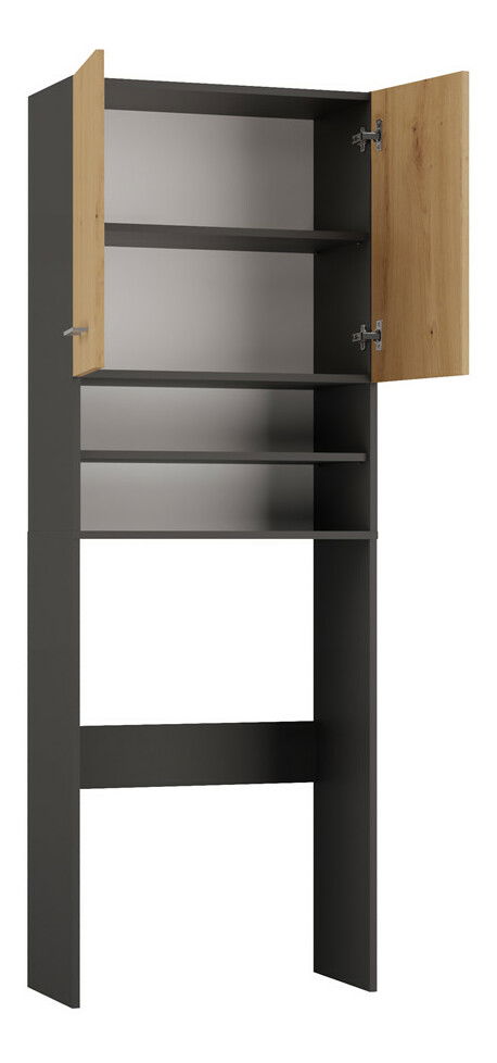 Skrinka nad práčku Perdieron 1 je ideálnym riešením pre moderné kúpeľne, kde sa cení efektívne využitie priestoru. S minimalistickou konštrukciou a elegantnou kombináciou farieb antracit a dub artisan ponúka praktické úložisko s dvoma poličkami za dvierkami a dvoma otvorenými poličkami, ktoré sú skvelé na uskladnenie uterákov a čistiacich prostriedkov. Vyrobená z kvalitnej laminovanej dosky s hrúbkou 16 mm, táto skrinka je nielen funkčná, ale aj esteticky príjemná, čím prispieva k modernému vzhľadu vašej kúpeľne.
