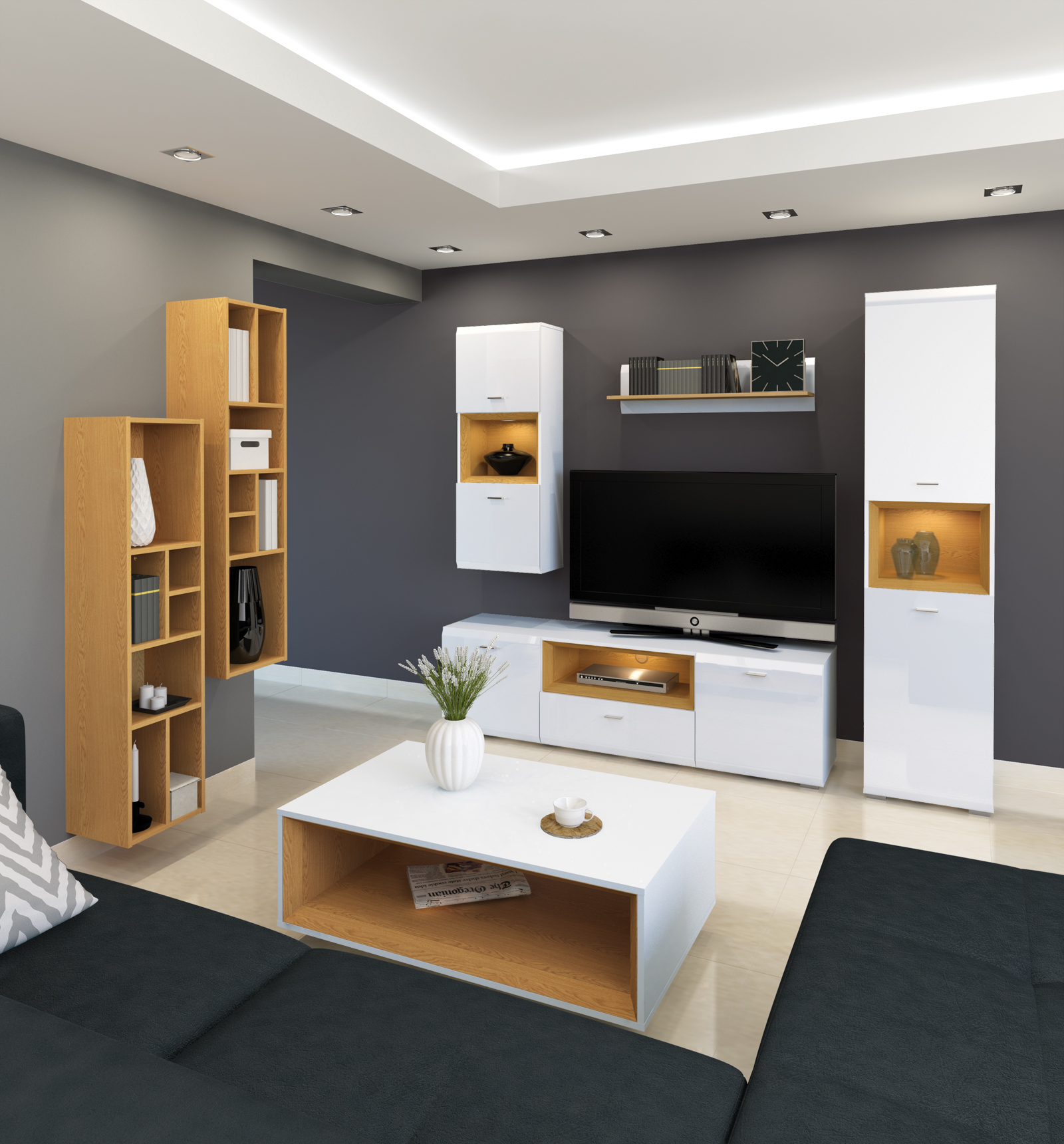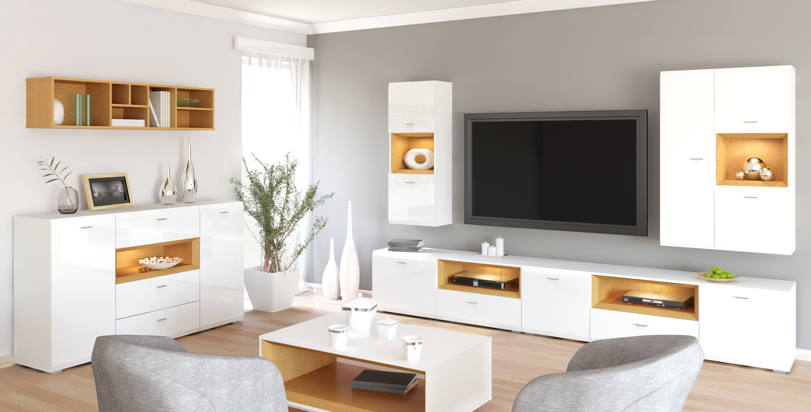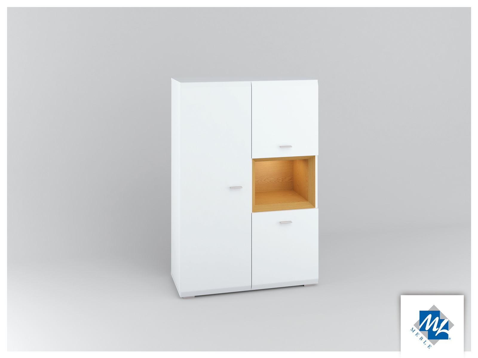 Nábytok je nevšedný kombináciou jemnej bielej farby, na dvierkach v lesku, a vnútrom vo farbe dreva dub svetlý, ktorý dokonale imituje prírodné drevo. Elegantné kovové úchyty dopĺňajú celkový dizajn modelovej rady. Voliteľné biele osvetlenie navodí ukľudňujúcu atmosféru v priestore. Dosky sú z lamina najvyššej kvality. Je odolné voči poškriabaniu, vlhkosti a vysokým teplotám. To Vám zaručí, že aj po čase bude vyzerať Váš nábytok stále ako nový. Zásuvky a dvierka obsahujú dorazový systém.