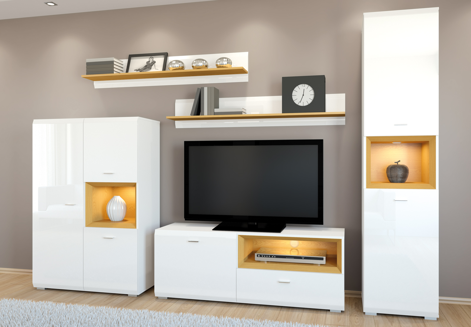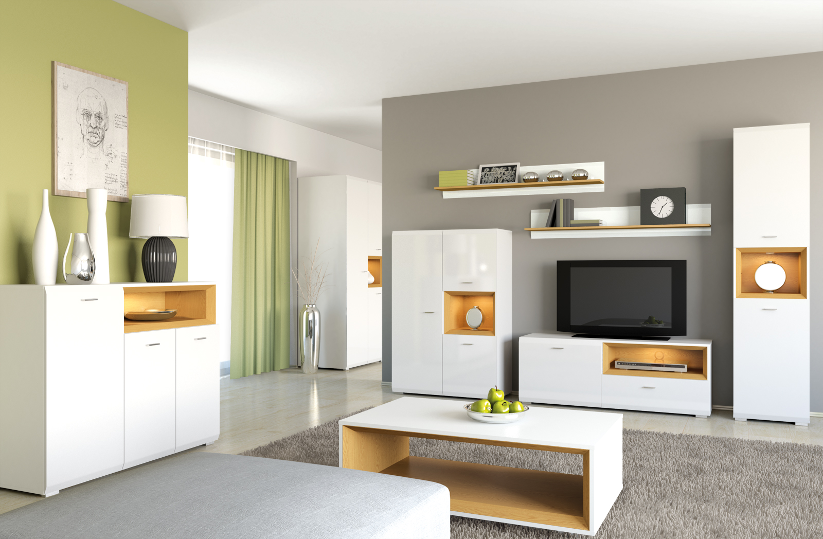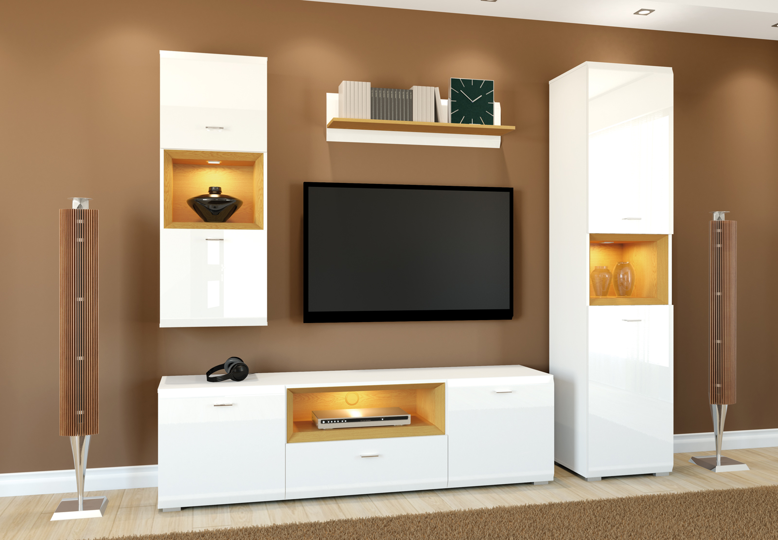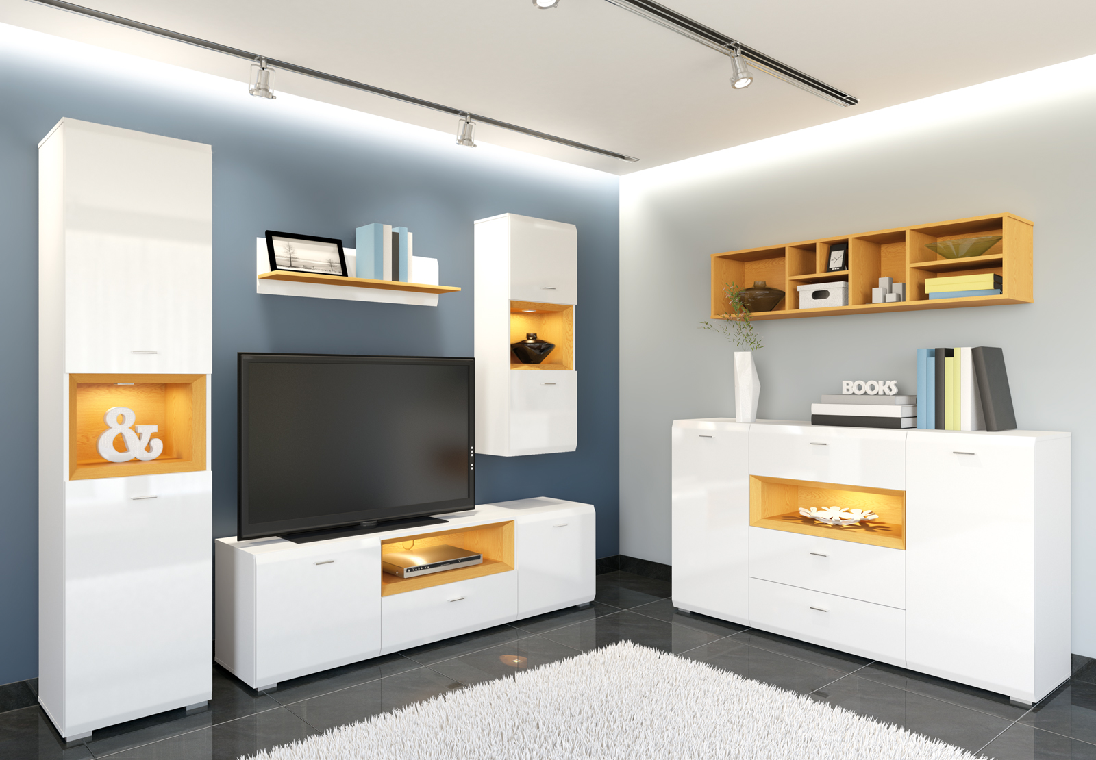 Nábytok je nevšedný kombináciou jemnej bielej farby, na dvierkach v lesku, a vnútrom vo farbe dreva dub svetlý, ktorý dokonale imituje prírodné drevo. Elegantné kovové úchyty dopĺňajú celkový dizajn modelovej rady. Voliteľné biele osvetlenie navodí ukľudňujúcu atmosféru v priestore. Dosky sú z lamina najvyššej kvality. Je odolné voči poškriabaniu, vlhkosti a vysokým teplotám. To Vám zaručí, že aj po čase bude vyzerať Váš nábytok stále ako nový. Zásuvky a dvierka obsahujú dorazový systém.