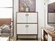 Ak hľadáte tradičný nábytok s moderným nádychom, táto komoda je skvelou voľbou. Je vyrobená z odolného MDF a stojí na stabilnom čiernom kovovom podstavci. Komoda má 2 police uzavreté dverami, ktoré poskytujú dostatok úložného priestoru, vďaka čomu je mimoriadne praktická. Dokonale spracované detaily, ako sú úchytky z umelej kože a matná predná strana s jemným vzorom, sú pútavé a dodávajú komode jedinečný vzhľad.