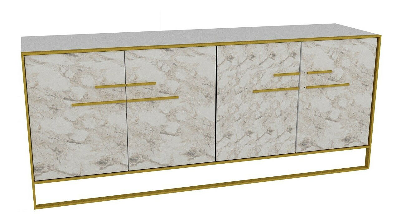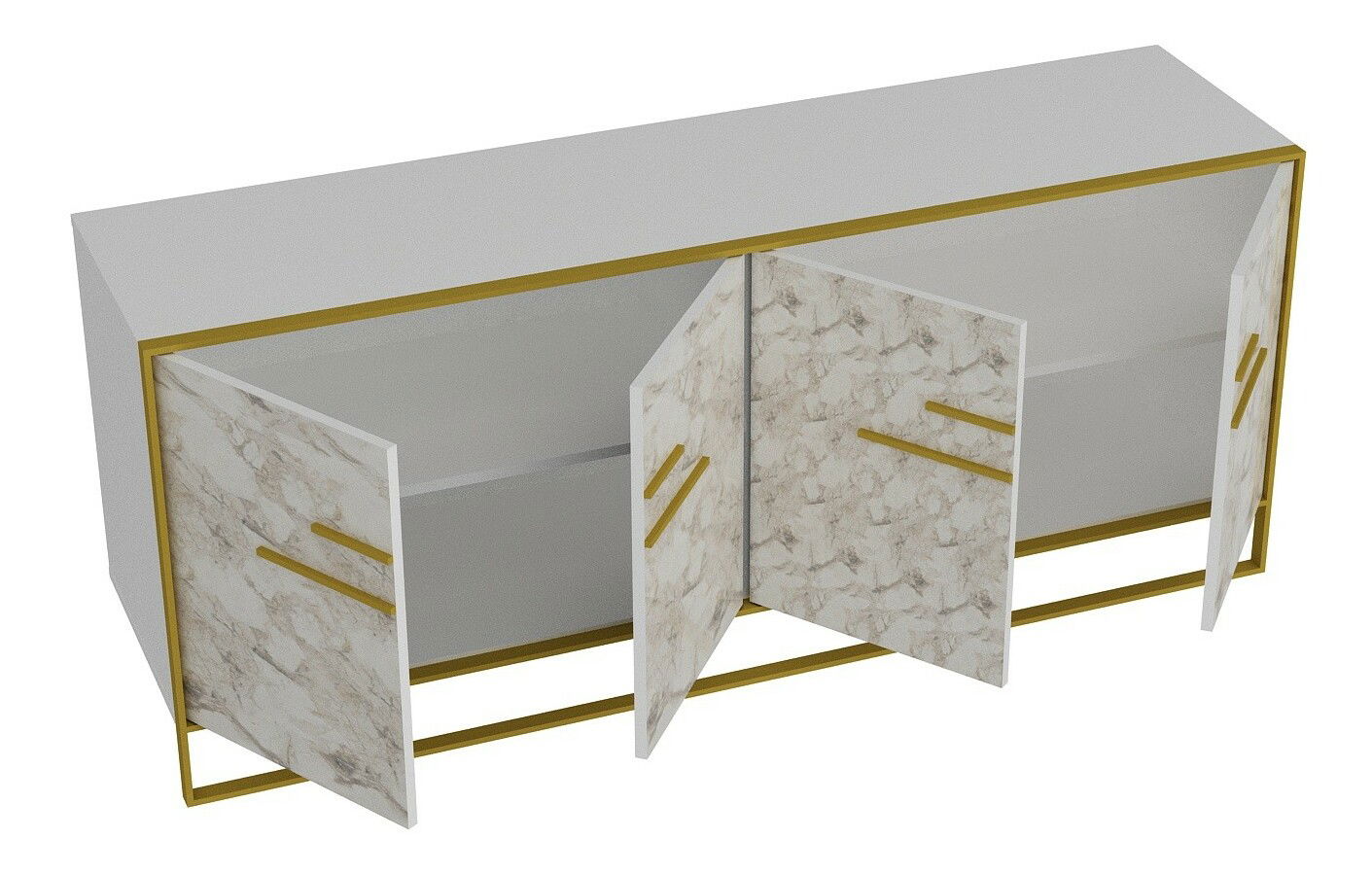 Skrinka - Poppy je elegantný a funkčný kúsok nábytku, vhodný do každej modernej domácnosti. S výškou 75 cm, šírkou 179.9 cm a hĺbkou 47.3 cm poskytuje dostatok úložného priestoru na usporiadanie vašich vecí. Skrinka má kombináciu zlatej a bielej farby, ktorá dodáva priestoru elegantný a štýlový vzhľad. Je vyrobená z kvalitných materiálov, čo zaručuje jej pevnosť a odolnosť. Skrinka - Poppy je ideálna na uskladnenie oblečenia, obuvi, kníh alebo iných predmetov. Svojím moderným dizajnom a praktickými regálmi je táto skrinka perfektným doplnkom vášho interiéru.