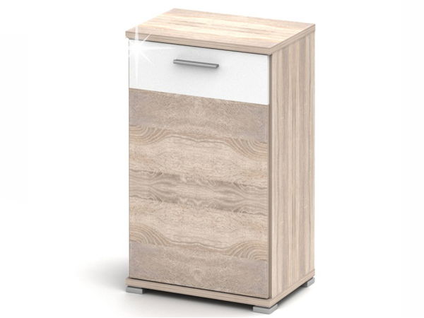 Trendová skrinka, ktorá vie potešiť oko v každej miestnosti. Vybavená je dvierkami, za ktorými sa nachádza 1 polička. Horná časť dvierok je v bielej farbe vo vysokom lesku, korpus a zvyšok dverí je prevedenie dub sonoma. Úchyt je sivý a materiál je DTD laminovaná.