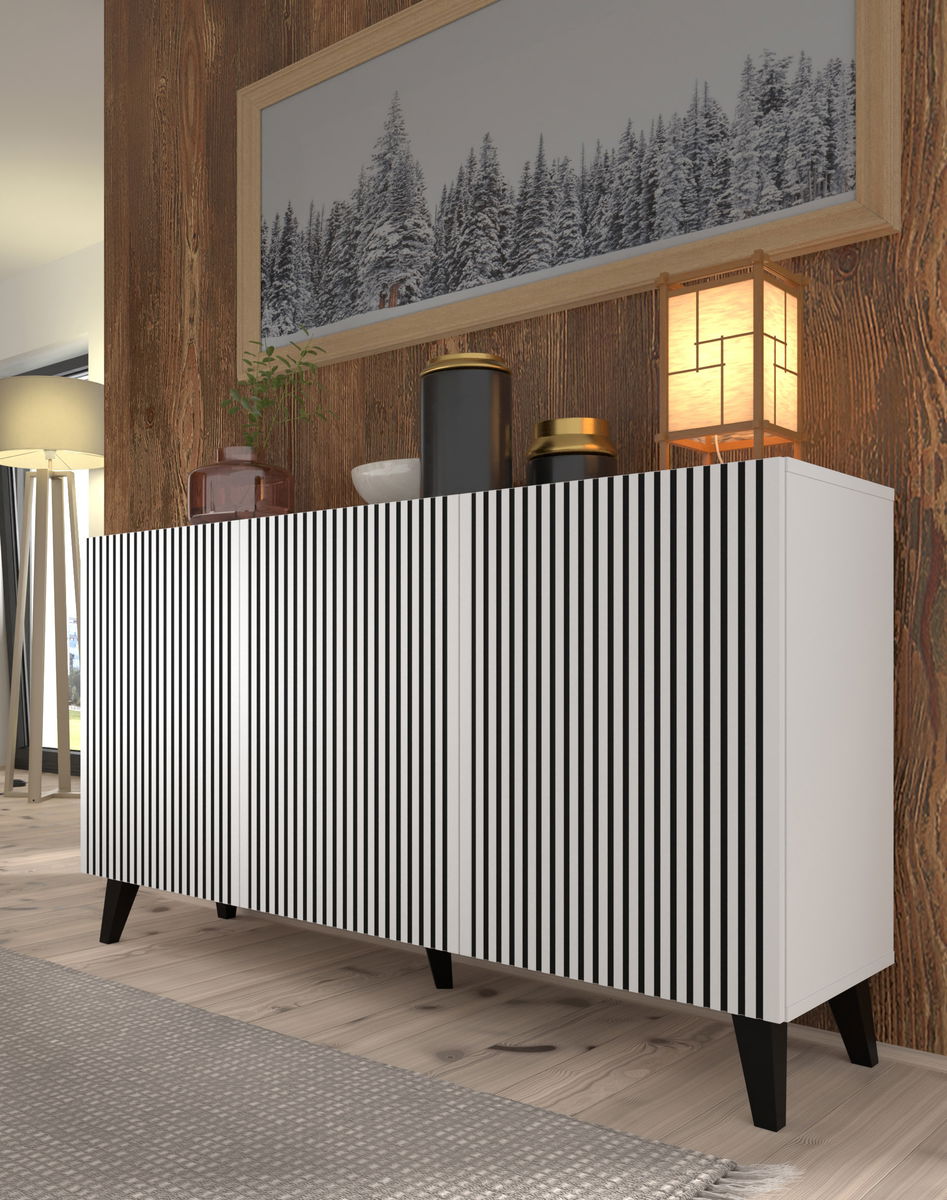 Komoda Rawy 3D (biela) s výškou 87 cm, šírkou 150 cm a hĺbkou 42 cm je nábytkový kúsok z kolekcie, ktorá okúzľuje svojou eleganciou a jedinečným dizajnom. Je vhodná do moderných interiérov a dokonale sa hodí do obývačiek a jedální. Tvar komody je jednoduchý a dokonale ladia s frézovanými čelami. Kovový rám, ktorý podopiera telo, zaisťuje stabilitu a dodáva štýl a výraznosť. Táto biela komoda je skvelým doplnkom do vášho domova a poskytne vám dostatok úložného priestoru pre vaše veci.