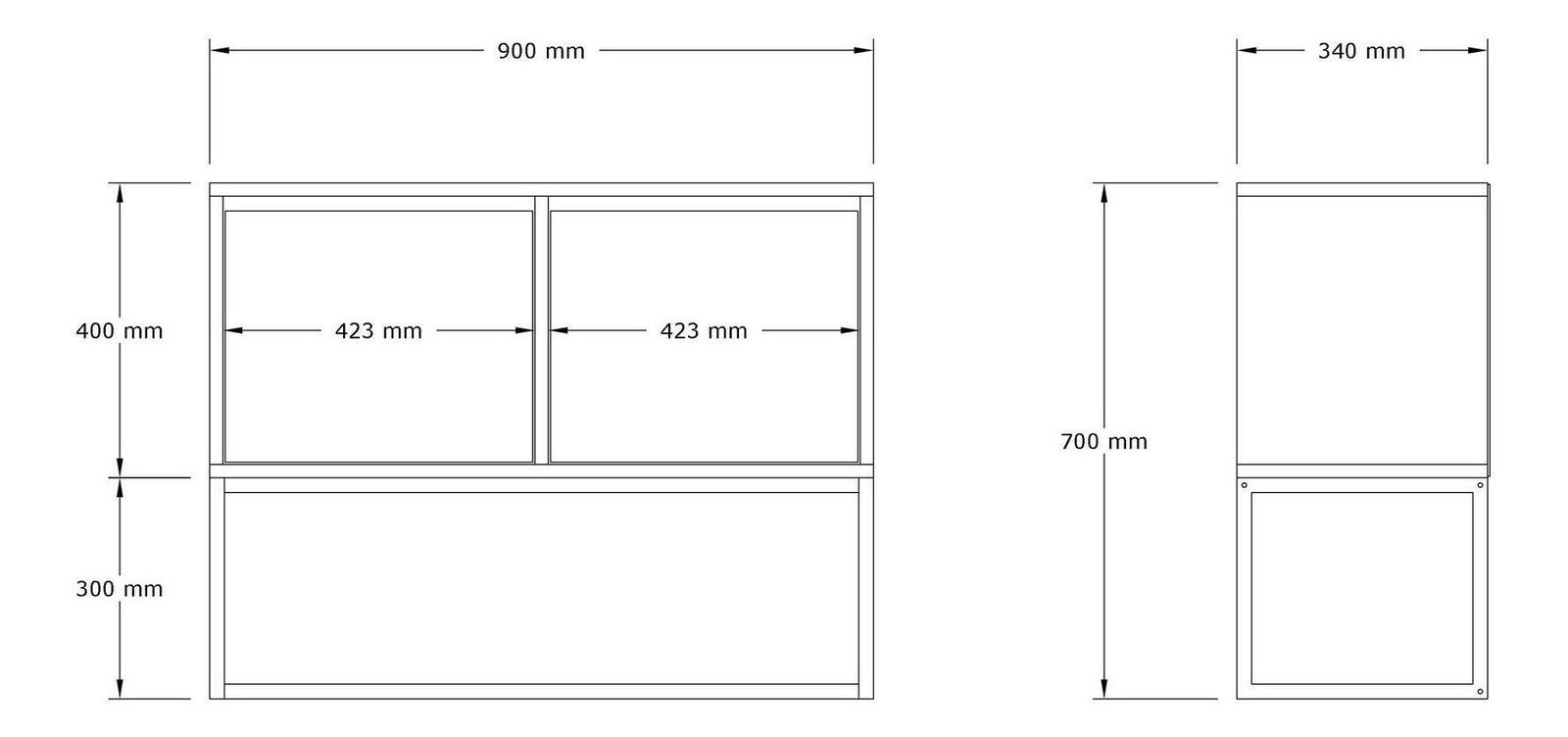 hrúbka: 18 mm, šírka: 90 cm, výška: 70 cm, hĺbka: 34 cm, výška police: 40 cm, šírka police: 42,3 cm, výška nohy: 30 cm
