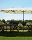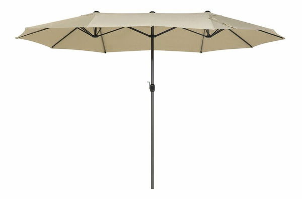 Široký dvojitý záhradný slnečník je vynikajúcim pomocníkom do vášho moderne zariadeného vonkajšieho priestoru. Pozostáva z robustnej hliníkovej tyče s práškovým nástrekom a polyesterovej strechy s dvanástimi rebrami, vďaka čomu je mimoriadne odolný. Dodáva sa s kľukovým mechanizmom, ktorý umožňuje ľahké a rýchle otvorenie a zatvorenie. Tento záhradný slnečník je elegantným kúskom, ktorý je odolný voči UV žiareniu a vydrží aj občasné vystavenie dažďu.