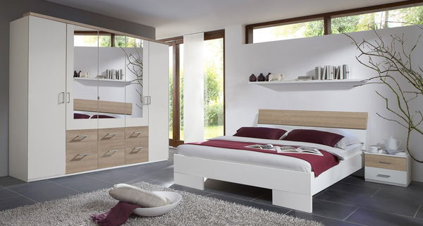 Spálňová zostava Cleo je moderného prevedenia. Je zložená z 5-dverovej skrine, manželskej postele a 2 ks. nočných stolíkov. Tento nábytok vyrába certifikovaný nemecký výrobca, ktorý si zakladá na vysokej kvalite svojich produktov. Korpus a dvierka sú z kvalitnej LTD vo farbe alpská biela v kombinácii s dubom. Skriňa obsahuje praktické zrkadlá a 6 zásuviek. Vešiaková tyč a pojazdy sú z kovu. Posteľ neobsahuje rošt ani matrac. Nočné stolíky obsahujú dve praktické zásuvky. Úchyty sú z plastu vo farbe alumínium.