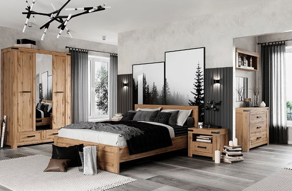 Spálňa Mateo predstavuJe to moderný nábytok – je to atmosféra. ú zostavu s výrazným rustikálnym charakterom, kde dominuje prírodné drevo a elegantné detaily. Zostava obsahuje manželskú posteľ, nočné stolíky, komodu a priestrannú šatníkovú skriňu so zrkadlom. Robustné drevené prvky dodávajú miestnosti hrejivý a útulný vzhľad, zatiaľ čo moderné čierne akcenty vytvárajú vizuálny kontrast a sofistikovaný dojem. Spálňa Mateo je ideIdeálna pre tých, ktorí hľadajú kombináciu tradičného dreveného dizajnu s modernými prvkami a dôrazom na vysokú kvalitu a funkčnosť, ktorá zanechá dojem a pocit výnimočnosti.