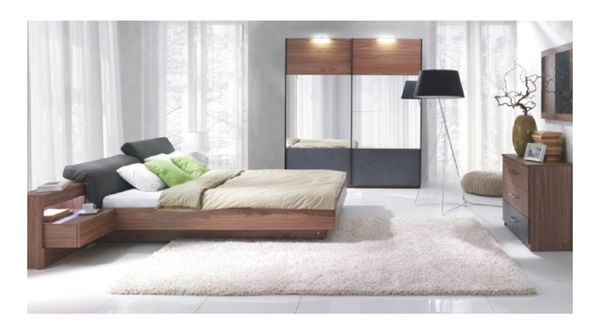 Zostava obsahuje manželskú posteľ s dvoma nočnými stolíkmi a šatníkovú skriňu so širkou 200 cm. Všetky produkty je možné zakúpiť aj samostatne. Dokúpiť môžete aj komodu alebo skriňu so šírkou 250 cm. Posteľ má čelo čalúnené ekokožou a je polohovacie.