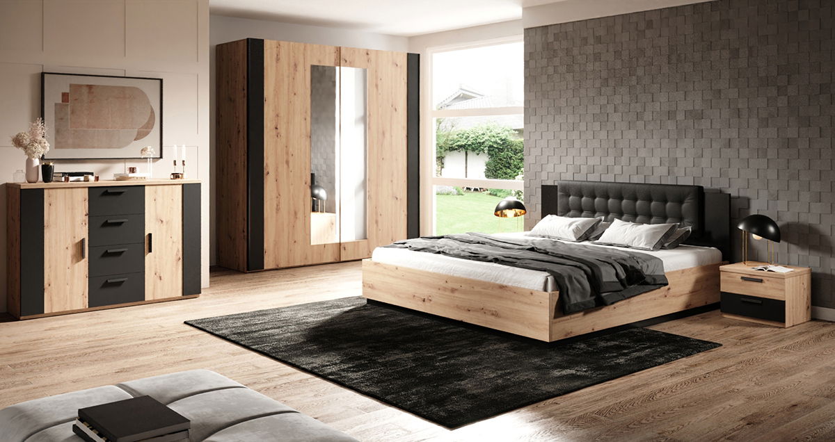 Centrálnym prvkom tejto sp je priestor, kde sa funkčnosť snúbi s estetikou. Modernálne je pohodlná posteľ s čalúneným čelom, ktoré pridáva na komfort a luxusný vzhľad. Priestranná šatníková skrinka so zrkadlovými poskytuje dostatok úložného priestoru a zároveň dverami zväčšuje miestnosť. Komoda a nočné stolíky sú praktickým doplnkom, ktorý ponúka ďalšie možnosti uskladnenia a udržiavanie poriadku. Spálňa Signat je navrhnutá tak, aby spojili moderný štýl s pracovať, čo z najužitočnejšieho najlepšieho pre tých, ktorí hľadajú kvalitný a esteticky príjemný nábytok. Každý detail v tejto spálni je starostlivo premyslený, aby vytvoril harmonický a komfortný priestor na každodenný život. Ideálne pre každodenný život aj výnimočné chvíle.