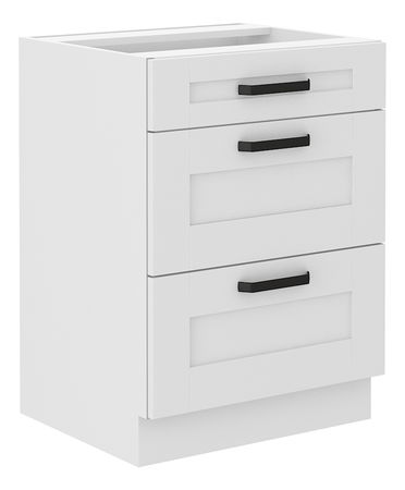 Spodná skrinka Lesana 1 (biela) 60 D 3S BB má výšku 82 cm, šírku 60 cm a hĺbku 52 cm. Je to štýlové a praktické riešenie pre vašu kuchyňu. Kuchynská linka Lesana je vyrobená z kvalitnej laminovanej drevotriesky DTD, ktorá je odolná voči mechanickému poškodeniu a má dlhú životnosť aj pri častom používaní v kuchyni. Výber z rôznych horných a dolných skriniek robí túto kuchynskú linku veľmi praktickou a funkčnou. Lesana má čisté línie a ponúka spojenie bieleho prevedenia s prevedením dub artisan. Spodná skrinka Lesana 60 D 3S BB je vybavená tromi šuplíkmi a dodáva sa bez pracovnej dosky, no s dolnou lištou (soklom). Môžete si však dokúpiť pracovnú dosku s hrúbkou 3,8 cm.