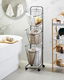 Praktický kovový stojan s drôtenými košíkmi vám poskytne dostatok úložného priestoru v kúpeľni či kuchyni. Je vyrobený z kovu s práškovou povrchovou úpravou, je ľahký a nenáročný na údržbu. Je ideálny na uloženie uterákov v kúpeľni alebo ovocia a zeleniny v kuchyni. V obývacej izbe vám poslúži na odkladanie novín a v spálni zas ako úložný priestor na prikrývky, oblečenie či hračky. Košíky možno jednoducho oddeliť od stojanu a používať ich aj samostatne. Stojan je vybavený 4 kolieskami a držadlami, vďaka ktorým ho možno jednoducho premiestniť z miesta na miesto.