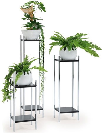 Elegantné stojany na kvety. V balení sa nachádzajú 3 kusy stojanov na kvety bez črepníkov. Prevedenie nožičiek je chrómová farba a poličky sú v odtieni čiernej. Každý z črepníkov má inú výšku.