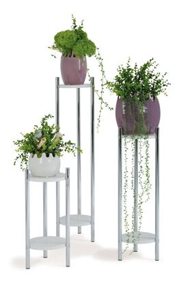 Tri kusy stojanov na kvety, ktoré sú v rôznej výške. Nohy sú v prevedení chrómovej farby a poličky sú bielej farby.