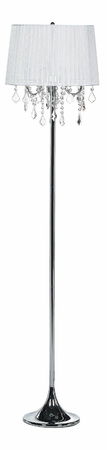 Táto stojaca lampa je kúskom, ktorý nesmie chýbať v žiadnej elegantne zariadenej spálni, obývačke či jedálni. Kombinuje vlastnosti klasickej lampy s tienidlom a elegantného lustra – rozptyľuje jasnú, jemnú žiaru, a to vďaka 3 žiarovkám a tienidlu z bielej látky, zatiaľ čo reťaze závesných kryštálov dodávajú lampe efektné čaro. Všetky prvky a detaily sú v zrkadlovo-striebornom prevedení, ktoré dokonale dopĺňa úžasný vzhľad tejto lampy.