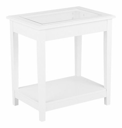 Tento univerzálny minimalistický stolík je skvelým kúskom do akéhokoľvek interiéru. Poslúži vám ako odkladací stolík vedľa pohovky v obývacej izbe alebo ako nočný stolík v spálni. Stolová doska z tvrdeného skla stolíku dodáva moderný vzhľad a možno na ňu umiestniť stolnú lampu alebo obľúbenú dekoráciu. Konštrukcia v bielom prevedení je vyrobená zo spracovaného dreva a jej čisté línie nádherne doplnia interiéry v tradičnom a vidieckom štýle.