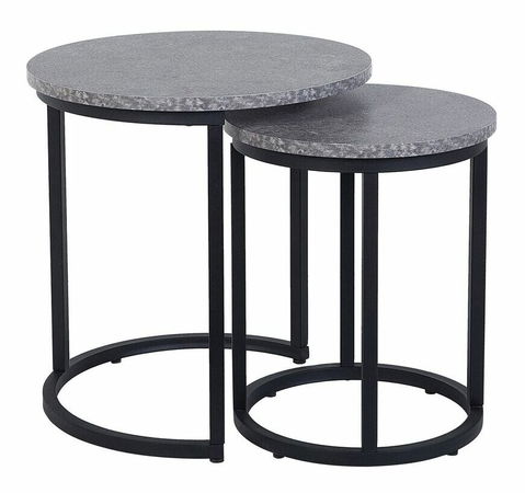 Rustikálna súprava dvoch okrúhlych stolíkov je skvelým doplnkom do obývacej izby. Ich moderný, minimalistický dizajn sa hodí k mnohým štýlom interiérového zariadenia. Stolové dosky ponúkajú dostatok priestoru na rôzne predmety a možno ich použiť spolu alebo samostatne. Kovová konštrukcia v čiernej farbe v kombinácii so stolovou doskou z MDF materiálu vo farbe betónu vydrží každodenné používanie a bude vám slúžiť roky.