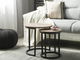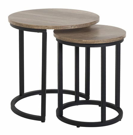 Rustikálna súprava dvoch okrúhlych stolíkov je skvelým doplnkom do obývacej izby. Ich moderný, minimalistický dizajn sa hodí k mnohým štýlom interiérového zariadenia. Stolové dosky ponúkajú dostatok priestoru na rôzne predmety a možno ich použiť spolu alebo samostatne. Kovová konštrukcia v čiernej farbe v kombinácii so stolovou doskou z MDF materiálu vo farbe dreva vydrží každodenné používanie a bude vám slúžiť roky.