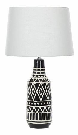 Táto krásna stolná lampa vnesie do vášho domova nádych etnického štýlu. Keramická základňa upúta zaujímavým vzorom geometrických tvarov kontrastujúcich s čiernym pozadím. V kombinácii s textilným tienidlom je skvelým doplnkom, ktorý vynikne na nočnom alebo konzolovom stolíku. Vďaka svetlému látkovému tienidlu bude zdrojom príjemného okolitého osvetlenia.