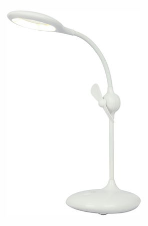 Stolová lampa plast biela satinovaný plast nabíjací kábel USB s mini ventilátorom stmievateľná farby je možné fixovať dotykový stmievač vrátane Li batérie 1200mAh DxŠxV: 138x122x420 vrátane 1ks žiarovky LED 32W 5V 210lm 4000K.
