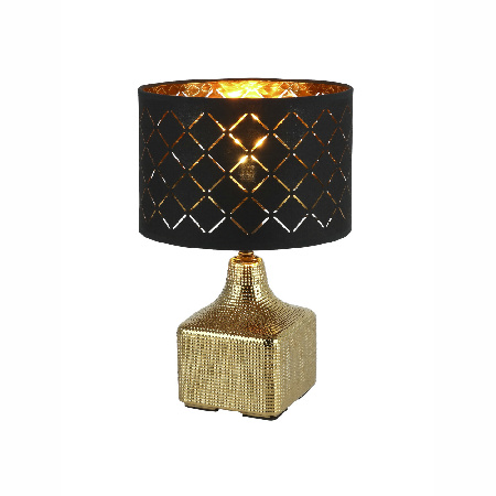 Stolová lampa keramika - zlatá, textil - čierno - zlatá, kábel 1,5m, vypínač, D: 250, H: 380, bez 1xE27 60W 230V