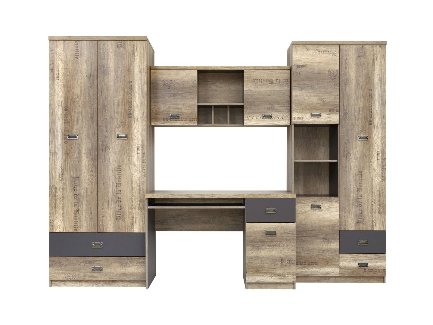 Študentská izba Malcolm v Dub Canyon Monument farbe s prídavkom sivého wolframu je ideálna pre každého, kto hľadá modernú, funkčnú a zároveň štýlovú izbu. Izba obsahuje vysoký úložný priestor, ktorý je rozdelený do rôznych častí pre usporiadanie vecí. Skrinky majú súvislé rukoväte, ktoré poskytujú dostatočný komfort pri otváraní a zatváraní. Stôl s poličkami je dostatočne veľký na písanie aj štúdium, čím poskytuje ideálny priestor pre študentov. Posteľ je vyrobená z kvalitného dreva, ktoré zaisťuje pevnosť a trvanlivosť. Celková výška izby je 205,5 cm, takže využíva priestor v miestnosti skvele. Vychutnajte si moderný a pohodlný študentský život s izbou Malcolm.