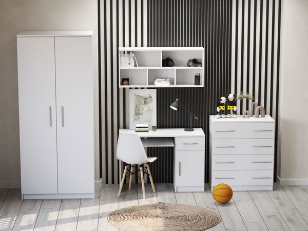 Študentská izba Oleg 1 v bielom prevedení je ideálnym riešením pre moderných študentov, ktorí hľadajú funkčný a štýlový priestor na učenie a oddych. Minimalistický dizajn nábytku vytvára čistý a uprataný vzhľad, ktorý podporuje sústredenie a kreativitu. Šatníková skriňa ponúka dostatok úložného priestoru pre oblečenie a osobné veci, zatiaľ čo komoda a polička poskytujú miesto na knihy a dekorácie. PC stolík je navrhnutý tak, aby zabezpečil pohodlné pracovné prostredie pre štúdium alebo prácu na počítači. S touto zostavou si vytvoríte harmonický a praktický priestor, ktorý podporí váš každodenný život.