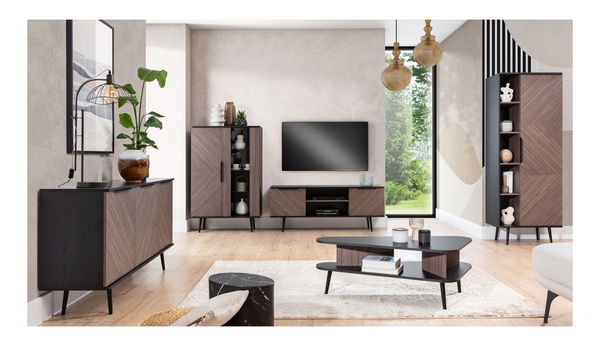 Harmonický aranžmán plný štýlu a triedy dodá súprava nábytku do obývačky Prenamora I. Extrémna praktickosť sa snúbi s nadčasovým vzhľadom. Súprava obsahuje prvky, ktoré pomôžu usporiadať celý priestor, ponúkajú sekcie na uloženie a vystavenie predmetov. Nájdete tu širokú komodu a vysokú policu, ktoré sú ako stvorené na uloženie najrôznejších predmetov od dokumentov, cez oblečenie, až po bytový textil. Vitrína zvýrazní krásu úžitkového skla a TV skrinka doplní TV plochu. Súčasťou súpravy je aj konferenčný stolík s nevšedným tvarom, ktorý skvele doplní nábytok v izbe.