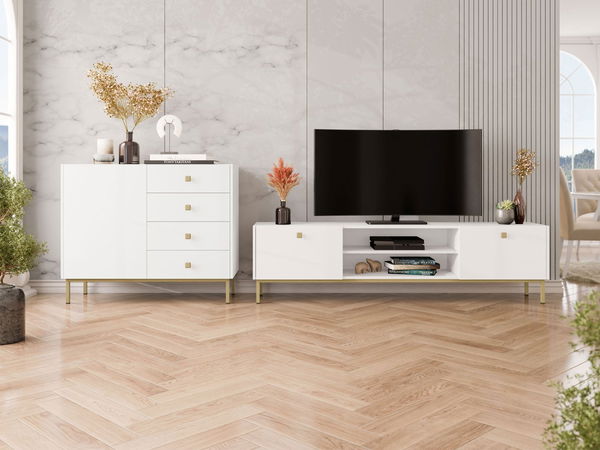 Objavte jednoduchý spôsob, ako si zariadiť obývaciu izbu. Súprava nábytku do obývačky Probazzo I dokonale doplní každý projekt. Táto súprava obsahuje komodu a TV skrinku. Každý z prvkov tejto súpravy je osadený na kovovom ráme, ktorý prispieva k optickému zväčšeniu miestnosti. Vďaka geometrickému tvaru a doplnkom v zlatej farbe je ťažké odtrhnúť oči od týchto modelov. Tlmená elegancia sa bude hodiť k moderným interiérovým dizajnom. Prezentovaný nábytok do izby poskytne úložný a dekoračný priestor.