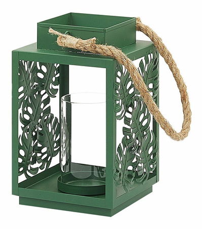 S týmto ozdobným lampášom môžete vo svojej izbe vytvoriť príjemnú atmosféru. Zelená farba a kovové ornamenty v tvare listov monstery robia z tohto doplnku praktickú dekoráciu ideálnu do jedálne alebo obývačky zariadenej v štýle boho. Zapáľte sviečku, umiestnite ju do skleneného držiaka a vychutnajte si pohľad na svetlo sviečky, ktoré bude vytvárať tiene v tvare listov.