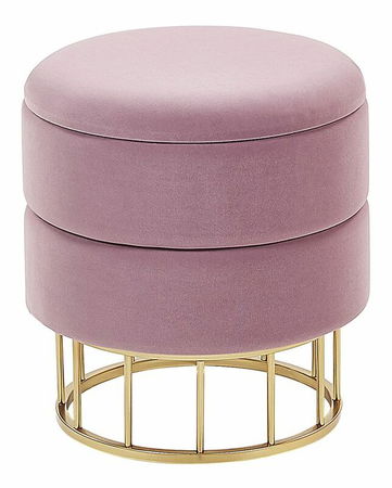 Skrášlite svoj interiér touto očarujúcou okrúhlou taburetkou. Jej zamatové čalúnenie v ružovej farbe je doplnené kovovým podstavcom v zlatej farbe, vďaka ktorému taburetka vynikne a upúta pozornosť. Vzhľadom na jej veľkosť ju možno použiť nielen ako extra miesto na sedenie, ale aj ako podnožku alebo ozdobný prvok v interiéri. Má aj úložný priestor, ktorý možno využiť na uloženie nepotrebných predmetov v obývacej izbe.
