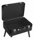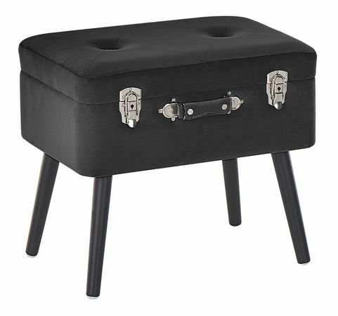 Táto taburetka inšpirovaná vintage tvarmi dokonale zvýrazní interiér v modernom, tradičnom aj glamour štýle. Je čalúnená čiernou zamatovou látkou, ktorú zvýrazňujú ozdobné gombíky, lesklé strieborné spony a štýlová rukoväť. Elegantné nohy dokonale dopĺňajú celkový dizajn tejto taburetky a dodávajú mu minimalistický charakter. Taburetka sa dá otvoriť rovnako ako skutočný kufor a poskytuje dostatok úložného priestoru na všetky drobnosti.