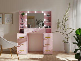 K toaletnému stolíku patrí aj stolička. Je na vás, aký typ vám vyhovuje – či vám stačí taburetka, dizajnové čalúnené kreslo alebo stolička s opierkou. U nás nájdete aj hotové zostavy, vrátane stoličky. Nesporne najdôležitejšou súčasťou toaletného stolíka je veľké zrkadlo. Bez neho by nebol stolík kompletný. Zo širokej ponuky si môžete vybrať rôzne veľkosti. Väčšie zrkadlá sú praktickejšie, pretože v nich môžete skontrolovať aj svoj celkový outfit. Odporúčame ho doplniť aj menšími zrkadlami po stranách. S tým veľmi úzko súvisí aj osvetlenie. Je rozdiel nanášať si make-up v tlmenom kúpeľňovom osvetlení a na prirodzenom svetle, kde vidíte všetky nedostatky. Ak máte možnosť, umiestnite stôl k oknu a pridajte ešte stolovú lampu. Keďže to má byť malý kúsok raja, doprajte si na stolík čerstvé kvety, fotku alebo inú dekoráciu, ktorá vám vždy vyčarí úsmev na tvári.