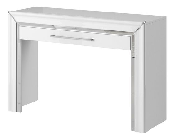 Tento toaletný stolík je praktickým a elegantným doplnkom do každej spálne či šatníka. Vyrobený z odolnej laminovanej drevotriesky s ABS hranami, zaručuje dlhú životnosť a jednoduchú údržbu. Dvierka sú potiahnuté vysokokvalitnou fóliou, ktorá dodáva stolíku moderný vzhľad a odolnosť voči každodennému používaniu. Stolík má jednu zásuvku na uskladnenie kozmetiky či drobností, pričom kovové strieborné rukoväte uľahčujú otváranie a pridávajú na elegantnom vzhľade. Strieborné olemovanie dotvára celkový štýl stolíka, ktorý skvelo zapadne do každého interiéru.