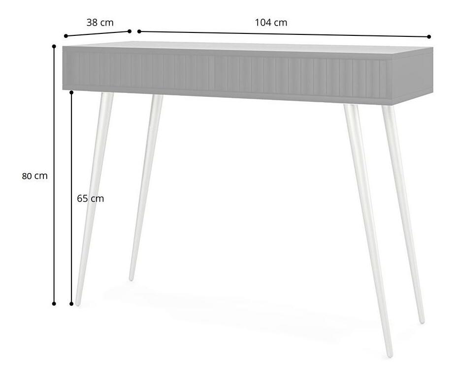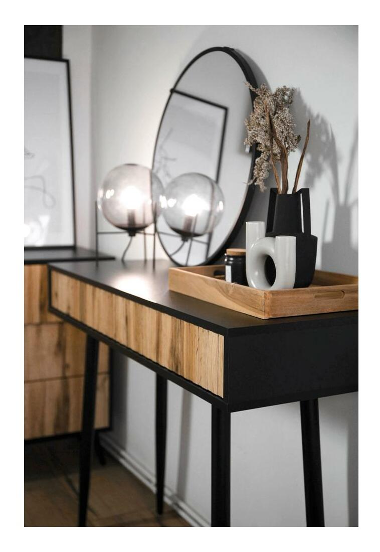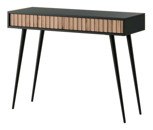 ZobraziťHľadáte nábytok, ktorý vám pomôže zariadiť jedinečný priestor ako z časopisu o interiérm dizajne? S toaletným stolíkom rýchlo a jednoducho zmeníte svoju obývačku na nepoznanie! Toaletný stolík je jedinečný dizajn a funkčnosť v jednom. Jednoduchá forma na čiernych úzkych nožičkách je obohatená o módne lamely vpredu, vďaka čomu to celé pôsobí veľmi štýl. Úspešne zapadne do interiérov zariadených v modernom, minimalistickom a industriálnom štýle, kde sa nepochybne stane ozdobou miestnosti. Výhodou toaletného stolíka sú dve zásuvky, ktoré vám umožnia skryť vaše súkromné veci pred zrakmi hostí, zatiaľ čo priestranná pracovná doska bude skvelým miestom na vystavenie vázy s kvetmi alebo štýlových doplnkov. Detaily produktu: korpus vyrobený - 16mm laminovaná drevotrieska, ktorá vďaka svojej odolnosti proti vlhkosti a poškriabaniu zaisťuje dlhé používanie, vysoké nožičky odľahčujú nábytok a uľahčujú udržiavanie poriadku, hrany nábytku sú spevnené ABS hranou , nábytok je možné zložiť svojpomocne.