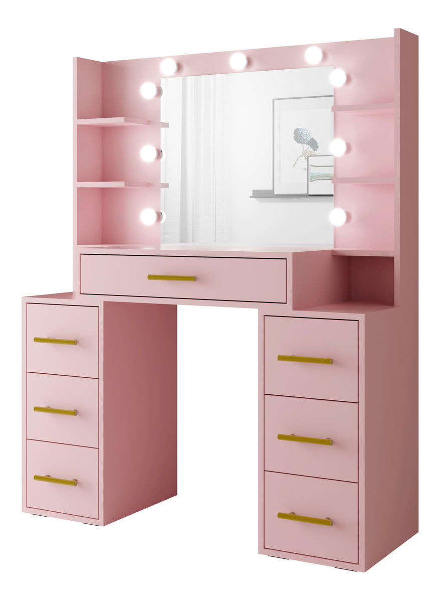 Toaletný stolík Bronetta 1 so zásuvkami, veľkým zrkadlom s LED osvetlením a praktickými policami predstavuje ideálne riešenie pre tých, ktorí ocenia spojenie funkčnosti s elegantným dizajnom. Viacero zásuviek poskytuje dostatok priestoru na uskladnenie kozmetiky, šperkov či doplnkov, čo uľahčuje udržiavanie poriadku a organizáciu. Veľké zrkadlo s kvalitným osvetlením zabezpečuje presné líčenie a zároveň dodáva miestnosti luxusný vzhľad. Police umožňujú vystavenie obľúbených produktov, čím nábytku pridávajú štýlový nádych. Pevná konštrukcia z kvalitných materiálov garantuje dlhodobú odolnosť a stabilitu. Elegantný vzhľad stolíka sa jednoducho začlení do rôznych interiérov, čím vytvára harmonický a sofistikovaný priestor na každodennú starostlivosť.