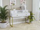 Toaletný stolík Cardinal (biela + zlatá) výška 95 cm hĺbka 50 cm Biela - s týmto očarujúcim toaletným stolíkom Cardinal získate nejen moderný dizajn s geomterickými tvarmi, ale aj industriálne kovové prvky. Štyri praktické zásuvky a vnútorná polička vám umožnia organizaovať vaše kozmetické a hygienické potreby. Elegantné úchytky sú dokonalým dokončením tohto stolíka. Rozmery spodných zásuviek sú 8,6x52,1x33,3 cm a rozmery vrchných zásuviek sú 8,6x31,2x22 cm. Výška nôh je 63,8 cm. Tento stolík bude dokonalým doplnkom pre váš interiér a poskytne vám dokonalý priestor pre vašu prípravu a starostlivosť o vaše telo.