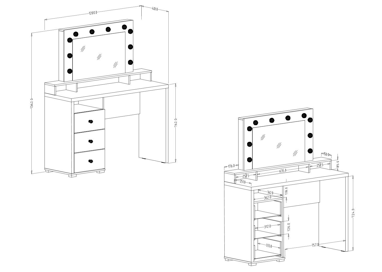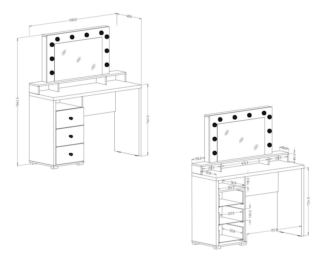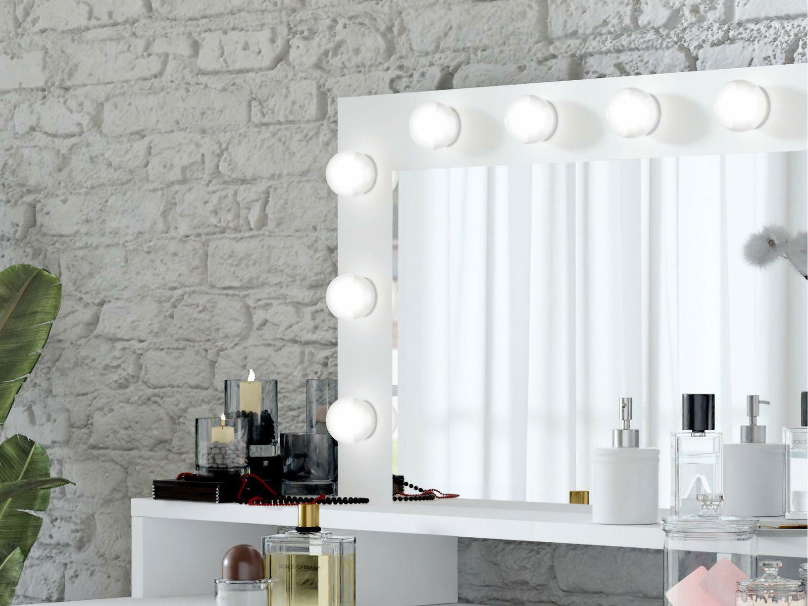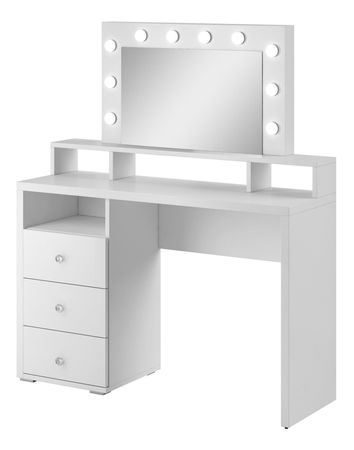 Toaletný stolík Dion Typ 49 v bielom vysokom lesku je dokonalým doplnkom elegantnej spálne. S výškou 136 cm a hĺbkou 40 cm poskytuje dostatok priestoru pre vaše kozmetické potreby, šperky a doplnky. Navyše, toaletný stolík je vybavený osvetleným zrkadlom a LED osvetlením, ktoré sú zahrnuté v cene balenia. Výnimočný dizajn a kvalitné materiály, ako je laminát, sklo a kov, robia z tohto kusu nábytku niečo viac ako len toaletný stolík. Ak hľadáte optimálny toaletný stolík pre vašu spálnu s dostatkom priestoru a elegantným vzhľadom, tento model Dion Typ 49 je pre vás tou správnou voľbou.