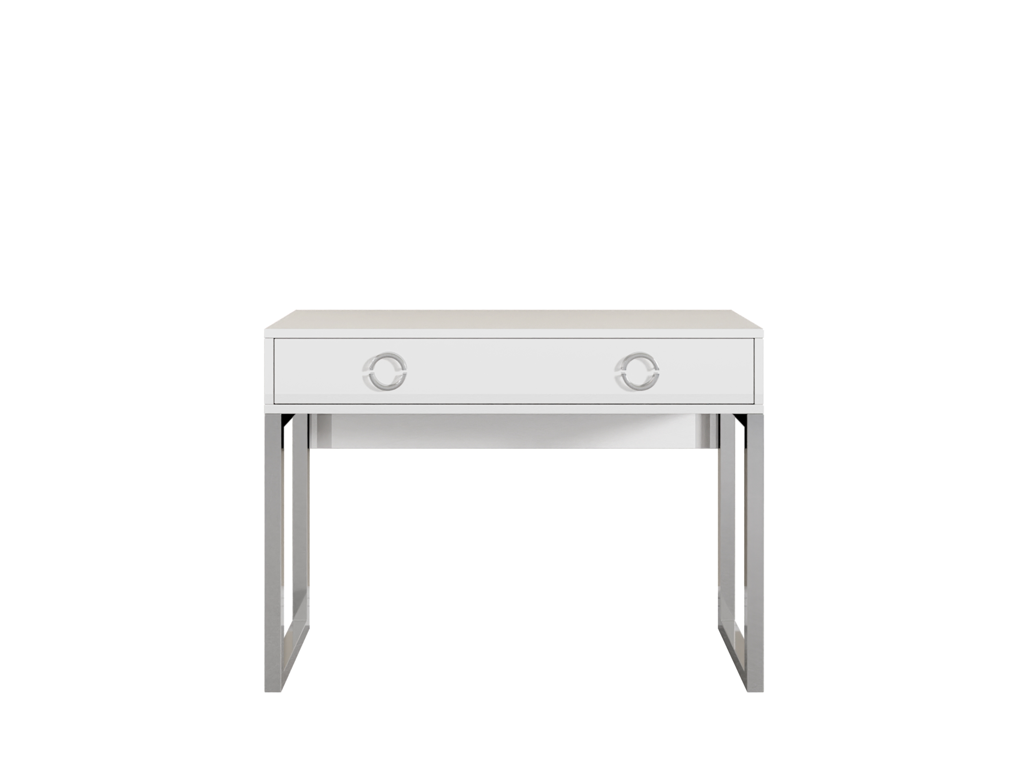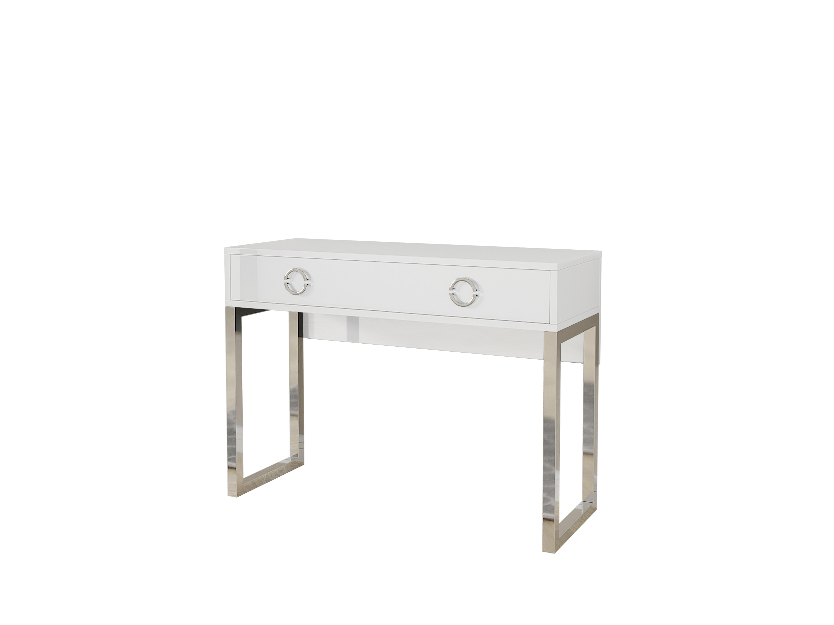 Toaletný stolík Loret (biely lesk) s výškou 80 cm a hĺbkou 40 cm pridá do vašej spálne modernú eleganciu. Jeho minimalistický dizajn s geometrickými tvarmi a kovovými prvkami vytvára industriálny vzhľad. Vďaka dvom praktickým zásuvkám s rozmerom (všh) 8,6 x 47,1 x 33,3 cm máte dostatok úložného priestoru pre vaše toaletné potreby. Biely lesk a elegantné úchytky dodávajú stolíku dokonalý vzhľad. Nohy s chrómovou úpravou majú výšku 61,2 cm. Toaletný stolík Loret je pre tých, ktorí hľadajú krásnu a praktickú kúpeľňovú zostavu.