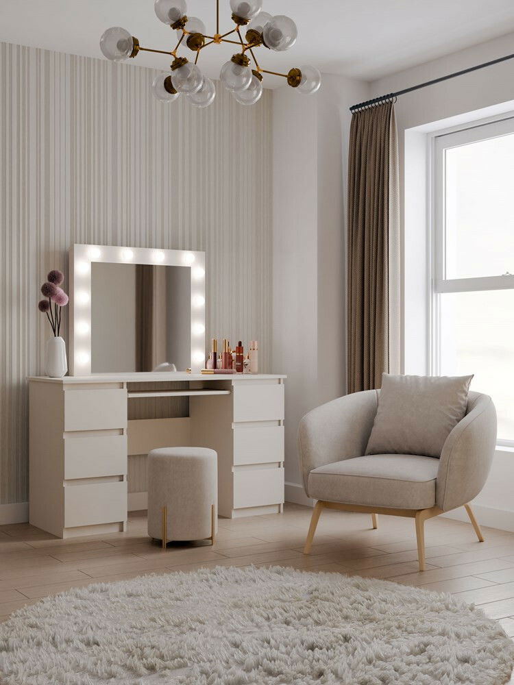 Toaletný stolík Micras 3 je dokonalou kombináciou elegancie a funkčnosti, ktorá osloví každého, kto si potrpí na štýlové a praktické riešenia. Jeho moderný dizajn v jemnom odtieni kašmíru dodáva interiéru nádych luxusu, zatiaľ čo šesť priestranných zásuviek zabezpečuje dostatok miesta na uskladnenie kozmetiky a šperkov. Osvetlenie LED s praktickým vypínačom umožňuje ideálne podmienky na líčenie, zatiaľ čo bezúchytové fronty zásuviek posilňujú minimalistický vzhľad. Tento nábytok je nielen esteticky príjemný, ale aj praktický, čím sa stáva neodmysliteľnou súčasťou každého moderného domova.