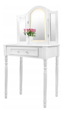 Toaletný stolík s taburetkou Chomik - Tudor (s LED osvetlením) v bielom prevedení má výšku 137 cm a hĺbku 40 cm. Tento štýlový toaletný stolík vám poskytne nový nábytok v akcentoch vintage. Umožní vám vďaka jednej prístupnej zásuvke uložiť si obľúbenú kozmetiku alebo šperky. Toaletný stolík je dodávaný s pohodlnou, čalúnenou taburetkou s kvetinovým vzorom, ktorá dodáva vášmu interiéru šarm a eleganciu. Kozmetické zrkadlo je vybavené teplým/studeným LED osvetlením, ktoré vám pomôže pri líčení aj v tmavom kúte miestnosti. Veľký zrkadlový panel s LED panelom uľahčuje dokonalý make-up. Toaletný stolík je vyrobený z MDF dosky, má 1 zásuvku a set obsahuje toaletný stolík, zrkadlo a čalúnenú taburetku. Rozmery taburetky sú 36x39x30 cm.