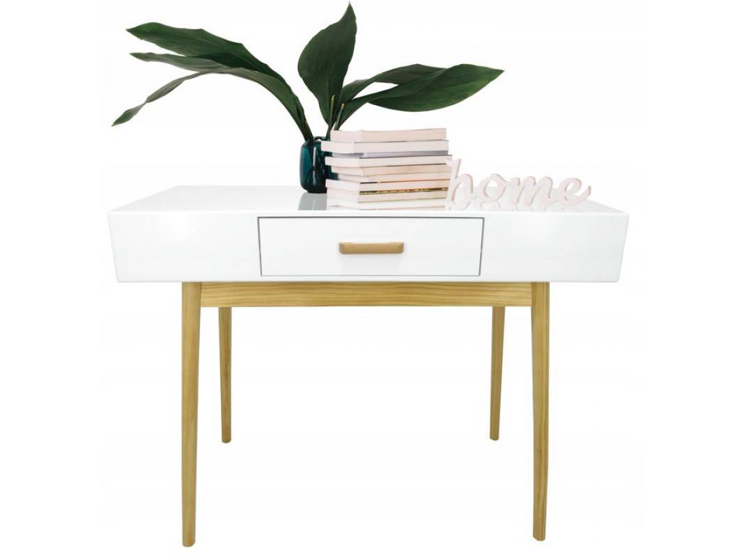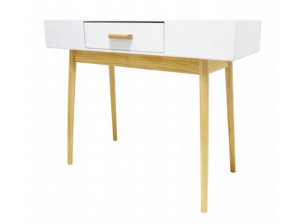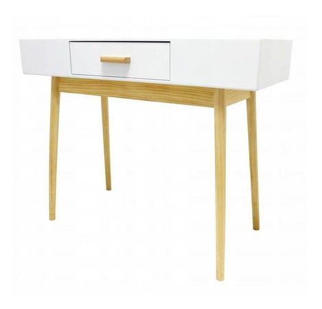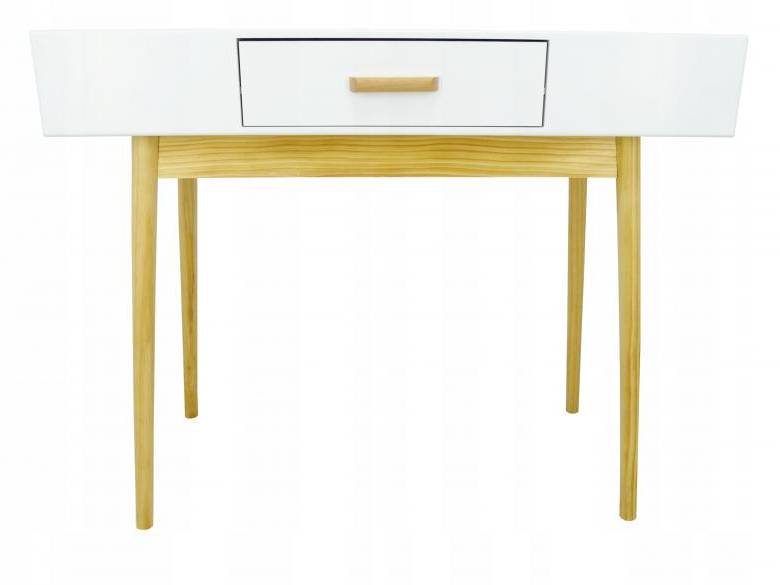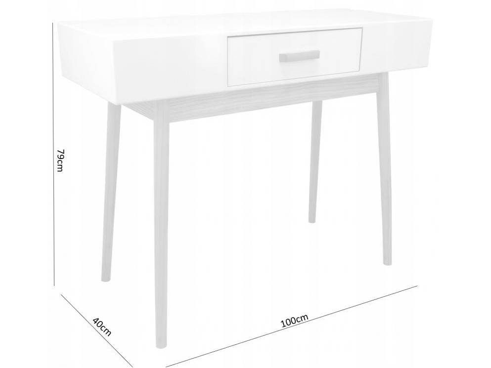 Toaletný stolík Chomik od Scandy je štýlovým doplnkom pre minimalistický interiér. S výškou 79 cm a hĺbkou 40 cm je vhodný nielen do spálne, ale aj do menších pracovní. Lakovaný vrch z MDF dosky a drevené nohy dodávajú tomuto toaletnému stolíku moderný vzhľad. Obsahuje jednu priestornú zásuvku s drevenými podlhovastými úchytkami, ideálne pre uloženie kozmetiky alebo šperkov. Vyrobený z masívneho dreva a MDF dosky v škandinávskom štýle, toaletný stolík Chomik je funkčným a praktickým riešením pre každého, kto hľadá dokonalú rovnováhu medzi dizajnom a funkčnosťou.