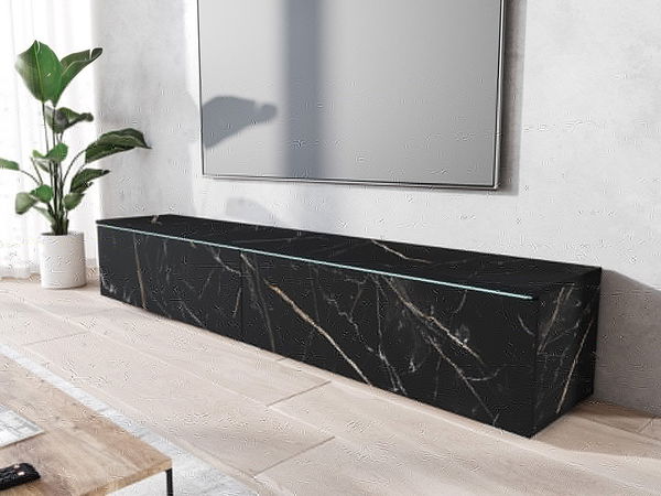 TV skrinka Dlone 180 je ideálnou voľbou pre tých, ktorí hľadajú pohodlie a štýl. TV skrinka Dlone 180 splní očakávania tých, ktorí hľadajú TV skrinku väčších rozmerov. TV skrinka Dlone sa určite stane skvelým nábytkom na vystavenie elektronických zariadení a uloženie nevyhnutného príslušenstva do domácnosti. Model Dlone je závesný, dostupný v moderných farbách. Rozmery: šírka: 180 cm, výška: 30 cm, hĺbka: 33 cm Prevedenie: korpus: korpus, vyrobený z laminovanej drevotrieskovej dosky v hrúbke 15 mm, viditeľné hrany lemované ABS páskou, zadná časť lemovaná papierovou páskou, dvierka: pri farbe biela/biely lesk sú dvierka v lesku vyrobené z dosky POLYGLOSS, laminovaná drevotriesková pri dekore bodega/bodega a beton/beton, lemované ABS hranovacou páskou, súčasťou balenia sú nohy a komponenty potrebné na zavesenie - skrinka má možnosť postavenia alebo zavesenia, všetko je súčasťou balenia, sklo nezaberá celú plochu pod stolovou doskou, je hlboké 10 cm osvetlenie LED je možné si doobjednať za príplatok Záručná doba: 24 mesiacov