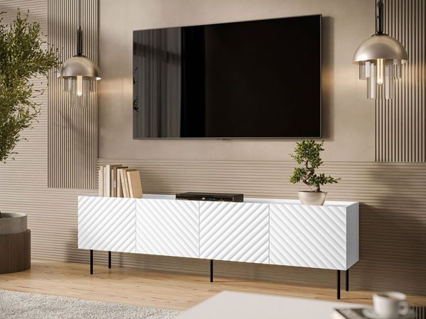 ZobraziťČelá TV skrinky Grotzi 200 4D do obývačky potešia originálnym dizajnom! Geometrický vzor dokonale zdobí TV kútik v obývačke a nedostatok tradičných úchytiek robí celok moderným a úhľadným. Interiér TV skrinky bol navrhnutý s ohľadom na maximálnu funkčnosť. Veľká šírka skrinky poskytuje primeraný priestor na uloženie rôznych médií, elektronických zariadení a ďalšieho potrebného príslušenstva. TV skrinka Grotzi 200 4D je doplnok, ktorý vo vašej obývačke nemôže chýbať!
