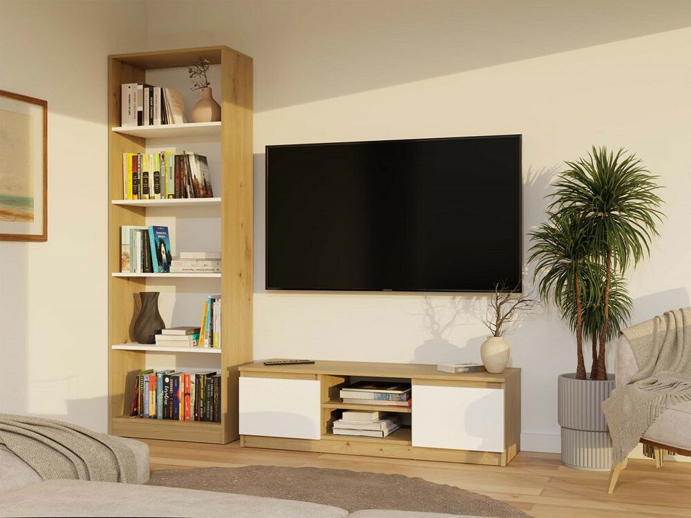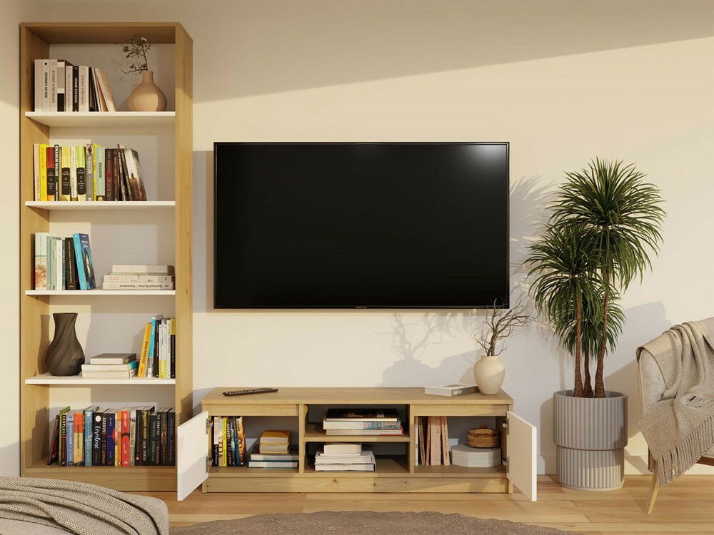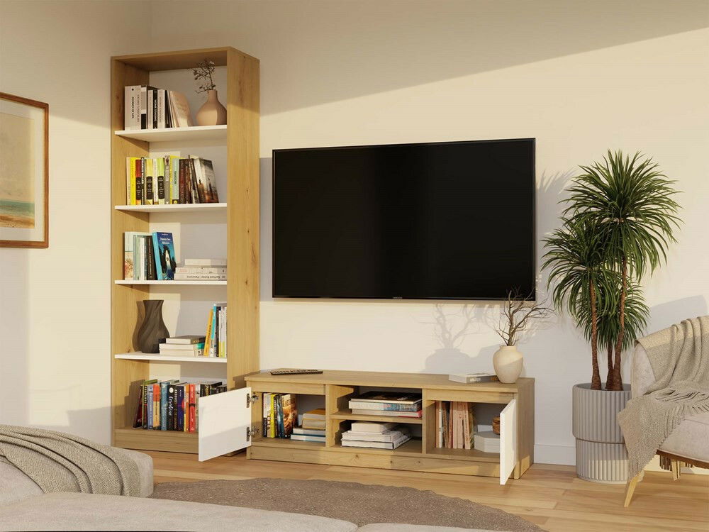 TV skrinka Musecalo 120 v kombinácii farieb dub artisan a biela je moderný a praktický nábytok, ktorý skvele zapadne do akéhokoľvek interiéru. S rozmermi 120 cm na šírku a 40 cm na hĺbku ponúka dostatok priestoru na umiestnenie televízora a dekorácií. Dve bočné skrinky bez poličiek poskytujú pohodlné úložisko pre rôzne zariadenia a drobnosti, zatiaľ čo otvorená polička umožňuje jednoduchý prístup k technike. Skrinka je vyrobená z kvalitnej laminovanej drevotriesky a dodáva sa s návodom na montáž, čo zaručuje jednoduchú a rýchlu inštaláciu.