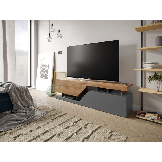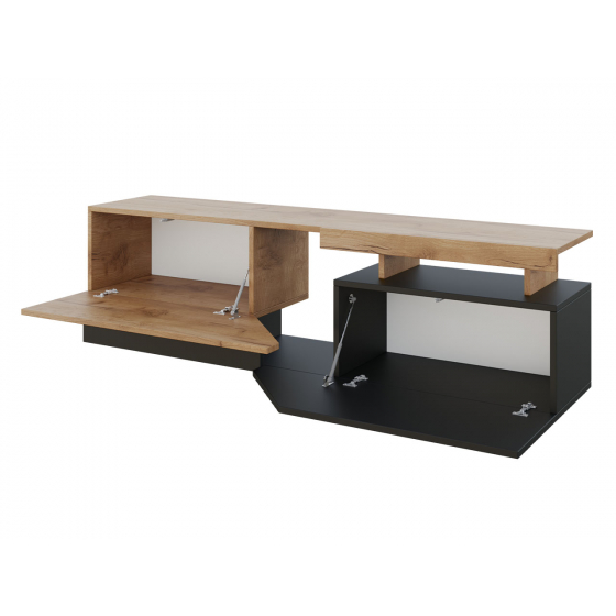 Televízna skrinka Bekas sa vyznačuje zaujímavou geometrickou štruktúrou, ktorá v kombinácii s použitými farbami dokonale zapadá do charakteru moderného aj podkrovného interiéru. Model Bekas ponúka dve skrinky, ktoré môžete otvárať systémom otvárania PUSH TO OPEN. Ďalšou výhodou je otvorená polica, kde môžete uložiť digitálny set-top box alebo televíznu hru. Televízna skrinka Bekas je vyrobená z kvalitnej laminovanej dosky.
