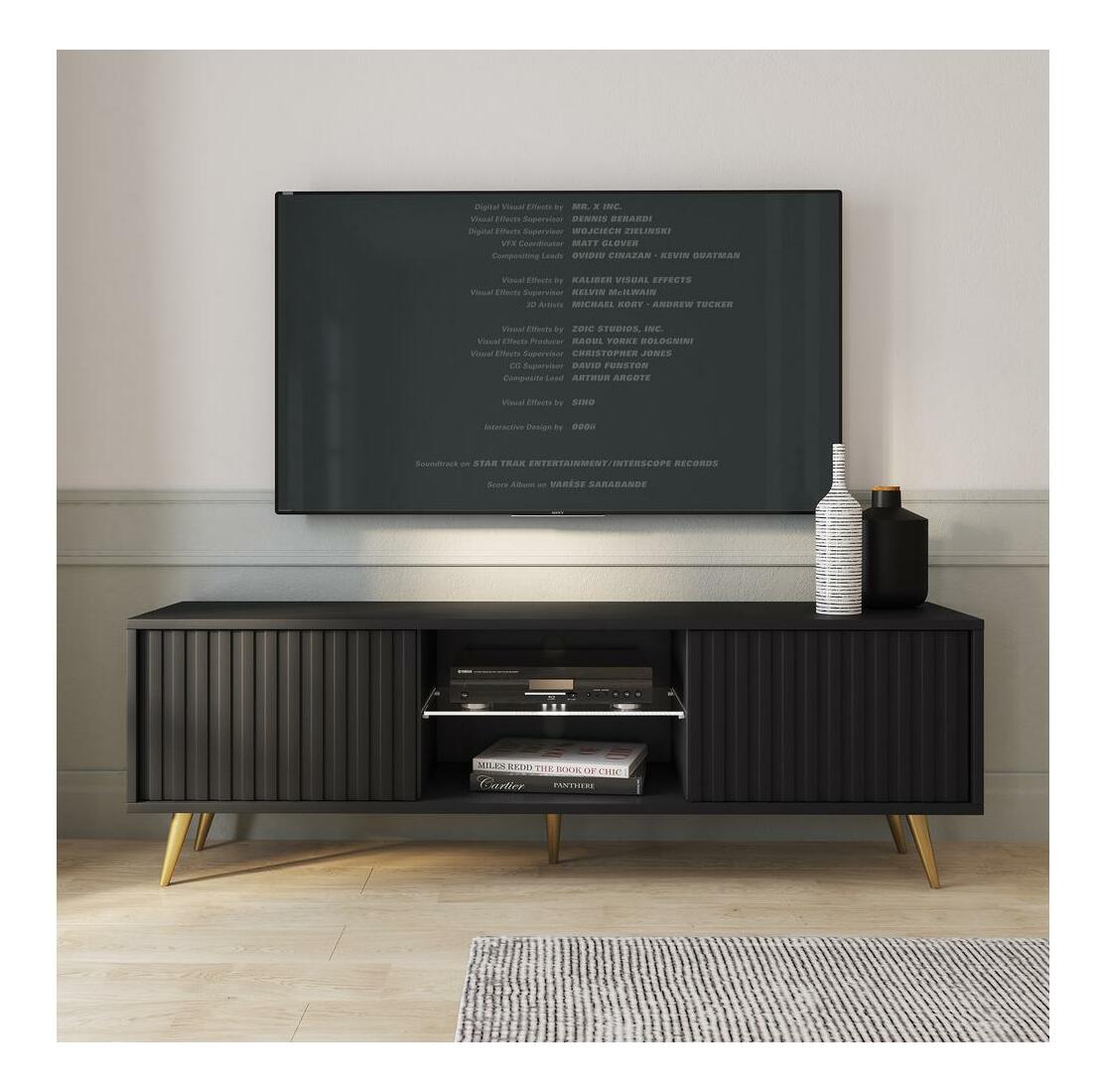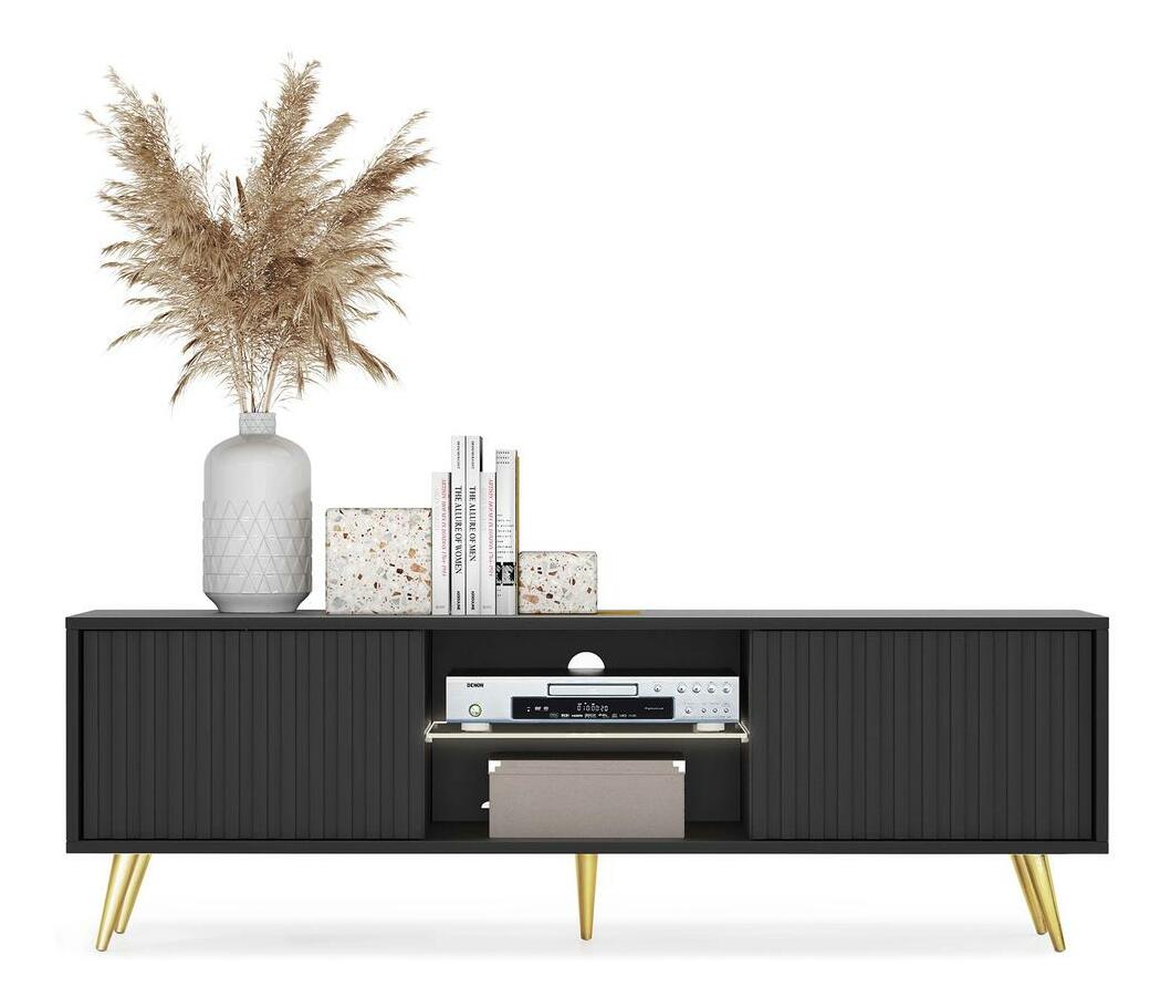 ZobraziťHľadáte nábytok, ktorý vám pomôže zariadiť jedinečný priestor ako z časopisu o interiérm dizajne? S TV skrinkou rýchlo a jednoducho zmeníte svoju obývačku na nepoznanie! TV skrinka má jedinečný dizajn a funkčnosť v jednom. Jednoduchá forma na zlatých, úzkych nožičkách je obohatená o módne lamely vpredu, vďaka čomu pôsobí celok veľmi štýl. Úspešne zapadne do interiérov zariadených v modernom, minimalistickom a glamour štýle, kde sa nepochybne stane ozdobou miestnosti. Výhodou je veľká kapacita uzavretých políc, ktoré vám umožnia skryť súkromné veci pred zrakmi hostí. Všetky doplnkové káble pre zariadenia, hry ku konzole a nabíjačky si tam ľahko nájdu svoje miesto a udržia tak v obývačke harmonický poriadok. Dve otvorené police budú ideálnym miestom pre dekodér, konzolu alebo dekoratívnu krabičku s drobnosťami. Celý je zavŕšený LED osvetlením, ktoré vo večerných hodinách vytvorí jedinečnú a romantickú atmosféru. Detaily produktu: korpus vyrobený - 16mm laminovaná doska, ktorá je odolná proti vlhkosti a poškriabaniu, zaisťuje dlhé používanie, predná strana vyrobená - MDF doska s PVC fóliou, nohy vyrobené - oceľ zlatej farby, ktorá zaisťuje stabilitu konštrukcie, polica s LED je vyrobený zo skla, hrany nábytku sú spevnené ABS hranou, nábytok je možné svojpomocne zložiť, farba: čierna.